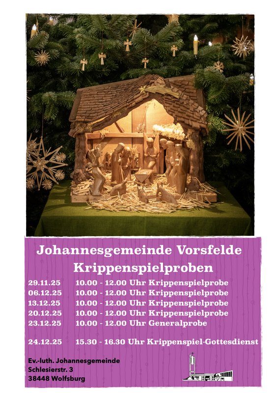 Am Samstag, den 29. November 2025 findet von 10.00 - 12.00 Uhr im Gemeindezentrum der Johannesgemeinde Vorsfelde (Schlesierstraße 3, 38448 Wolfsburg) die ersten Krippenspielprobe in diesem Jahr statt.